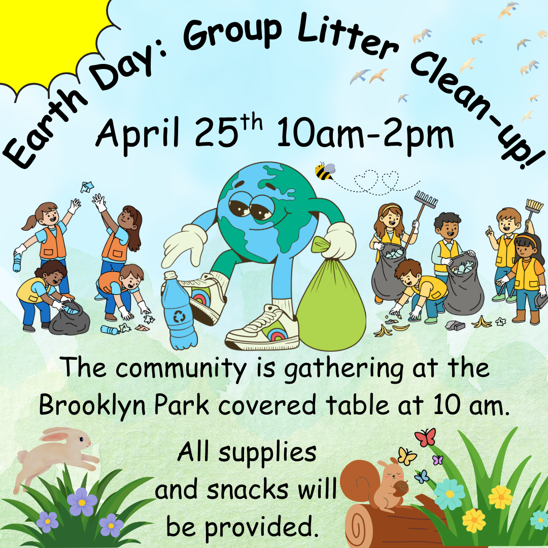 The community is gathering at the Brooklyn Park covered table at 10 am to celebrate Earth Day via a litter clean-up! Supplies and snacks will be provided.